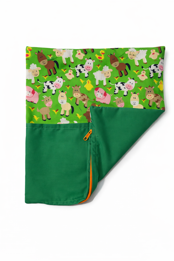 Make reading time extra special with this adorable farm animal reading pillow, featuring cute farm animals on a bright green background with a plain section for personalised text. Perfect for children who love animals, farms, and cosy story time.